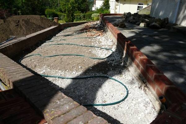 Выкопать яму не менее 30 см глубиной и заложить в неё основу из щебня или крупных камней. Для надежности периметр ямы можно заложить кирпичом (если не используете крупные камни).