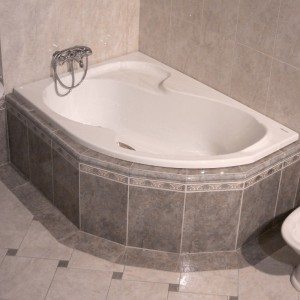 Что же касается формы ванны, то она определяется, как площадью санузла, так и желанием хозяев. Так, в просторные комнаты можно брать ванны круглой или, например, шестиугольной формы, так как такие модели требуют много места. А вот угловые и Пример установленной угловой акриловой ванны прекрасно подходят для гигиенических комнат любых размеров.