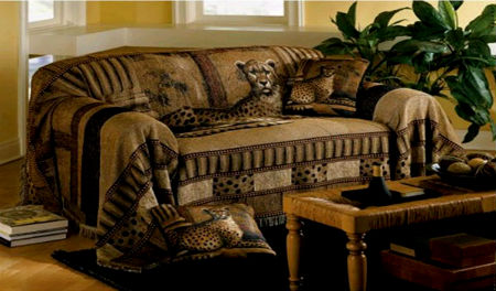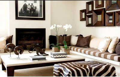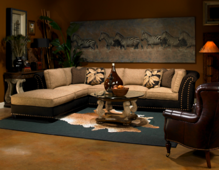 Отдельно можно приобрести несколько стильных кресел под кожу, чудесно будет выглядеть насыщенная коричневая обивка. Кроме того мягкую мебель можно покрыть подходящей окраски пледами, в сочетании к которым подобрать диванные подушки. В центре комнаты или с боку от дивана, установить журнальный столик, прекрасно выглядят тематические модели, к примеру со стеклянной столешницей, декорированной в стиле шкур животных. Ну а главным украшением Африканской гостиной, послужит объемное настенное панно, которое можно заказать из стекла с нанесенным изображением по технике фотопечати.