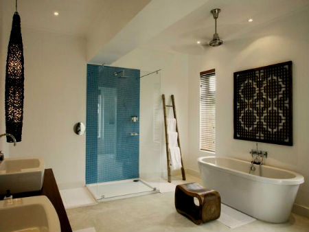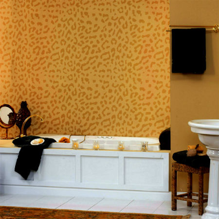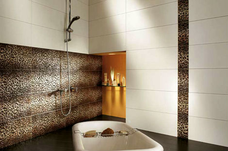 В оформлении Африканской ванной, можно сделать основной акцент на звериный принт, но использовать его частично. К примеру, основную поверхность стен покрыть простой светлой, однотонной плиткой, и лишь некоторые части, выделить плиткой под шкуру зебры или леопарда. Здесь не лишним будет отметить, что если выбор пал на плитку под зебру, то смесители и прочую фурнитуру лучше приобрести в хромированном исполнении. А в случае с плиткой под леопард, фурнитуру и смесители лучше подобрать в золотистом тоне.