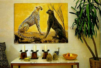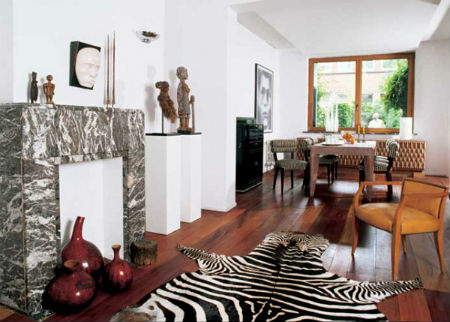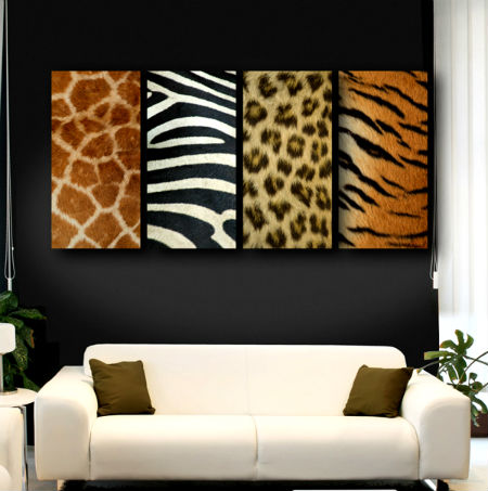 Стены. Африканские мотивы в интерьере легко воплотить при помощи фактурных полотен — фотообоев под шкуру животных, но чтобы помещение смотрелось гармонично, следует правильно разместить данные полотнища, путем чередования. Их можно разместить следующим образом, одна полоса светлая и однотонная, следующая — пестрая под шкуру животных.