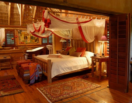 Дополнить помещение можно эффектными глиняными напольными вазами, украшенными африканскими принтами. На окна можно повесить воздушные белые прозрачные шторы, а также подобрать теневые шторы со звериным принтом. В качестве альтернативы шторам, можно использовать бамбуковые или соломенные жалюзи, сочетающиеся по тону с общим оформлением помещения. Кроме того нельзя забыть про тематические картины, подушки и покрывала. Дополнительно почитать про интерьер спальни в Африканском стиле можно здесь.