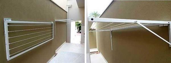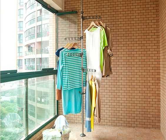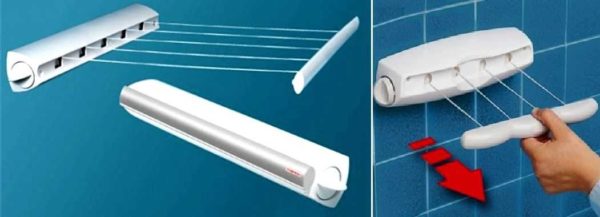 Усовершенствованный и облагороженный вариант — сушилка для белья на балкон со скручивающимися веревками. Состоит она из двух частей: стационарной, которую крепят к одной из стен, и мобильной, которую крепим на противоположную стену перед тем, как повесить белье, и убираем, когда оно высохло и снято.