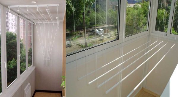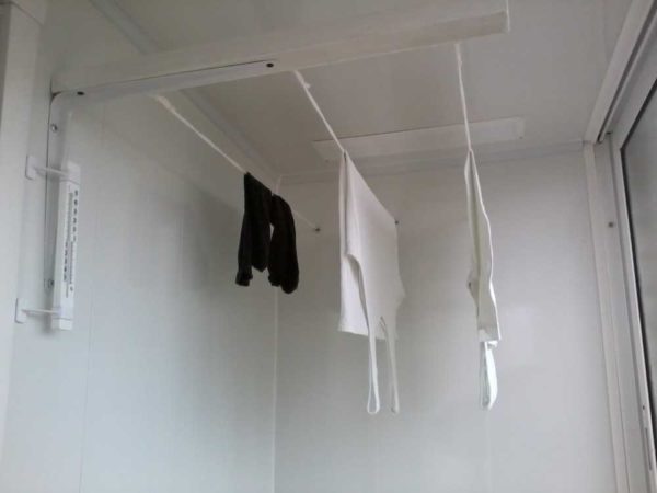 Сушилки для белья, закрепленные на потолке балкона или лоджии — одни из самых популярных моделей. Представляют собой две планки с прикрепленными к ним поперечинами или веревками, на которые навешивается белье.