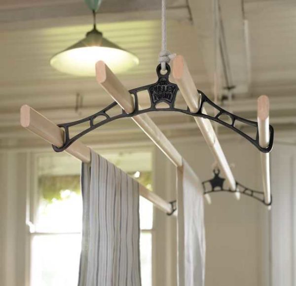Оснащены двумя-тремя крюками большого диаметра, которые позволяют цеплять конструкцию за горизонтальные перегородки, например, за балконное ограждение. Располагать их можно внутри помещения или снаружи, так что вариант мобильный и удобный. Вот только под хранение надо найти место или сделать на стене петли, за которые можно зацепить навесную сушилку для белья.