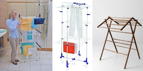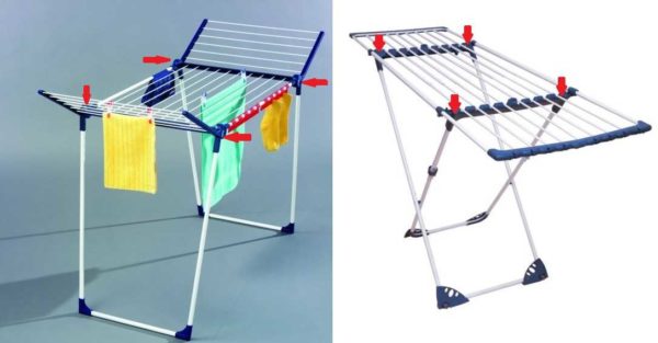 В любом более-менее крупном магазине, найдутся модели со складными ножками и откидывающимися боками. Причем есть как простые модели, так и с электроподогревом. В этом случае, внутри трубок, на которые навешивается белье, встроен маломощный нагревательный элемент. Если во время работы нагревателя притронутся к трубке, на ощупь она будет приятно теплой, но не горячей, так что вреда не будет даже для самых деликатных тканей.