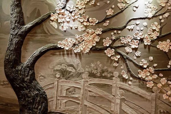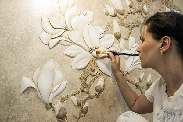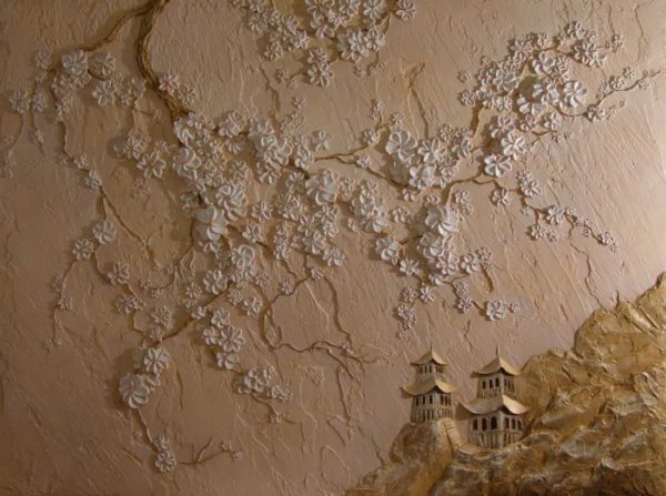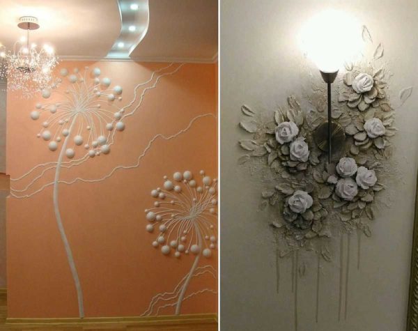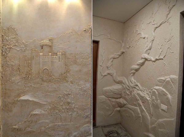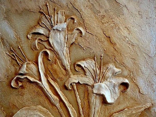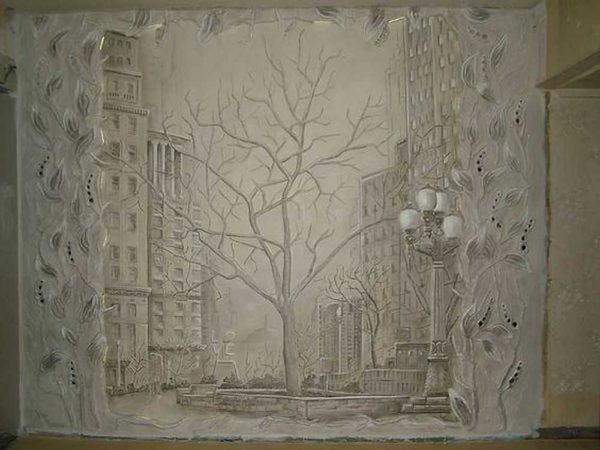 Без опыта очень сложно понять, что и как можно сделать при помощи обычной гипсовой штукатурки. На самом деле, объемные картины из гипса могут быть самой разной тематики, но наиболее распространенные — цветы, деревья и пейзажи (городские, загородные). В этом разделе мы собрали некоторое количество самых разноплановых барельефов на стене. С их помощью вы можете себе придумать тему для художественной лепки на стенах. По сути процесс похож на работу с пластилином.