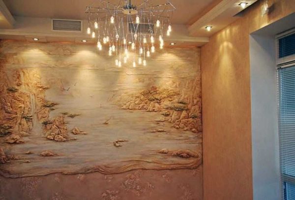 Один совет: барельеф на стене лучше смотрится при специально спроектированной подсветке. Так что перед тем, как выравнивать стену, проведите проводку, выведите концы. После того как выровняете и прогрунтуете поверхность, установите те светильники с теми лампами, которыми будете в дальнейшем подсвечивать рельефную картину. Вот при этом свете надо будет шлифовать сделанное вами объемное панно из штукатурной смеси. Только в этом случае смотреться все будет хорошо. Потому что, если работу проводить при другом освещении, при установке штатных светильников вы можете обнаружить «кошмар и ужас».