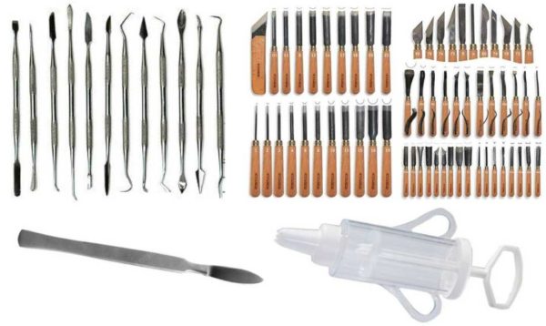 Это все инструменты, которые могут понадобиться. Из необходимых: кельмы, шпатель, стамески. Очень удобны мастихины, трудно бывает без скальпелей и кондитерского шприца. А вот стеки — это инструмент для перфекционистов — для точной доработки рельефа.
