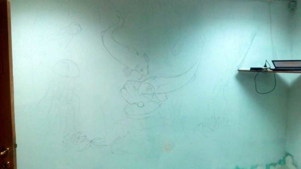 Для рельефной картины на стене была выбрана морская тема — с рыбками, осьминогом, водорослями. Отличный вариант для получения первого опыта! Легкий рисунок, который можно формировать постепенно.