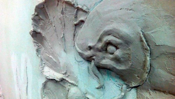В данном барельефе самые выступающие части — рыбы и раковина с жемчужиной. В те места, где будет уложен толстый слой и вкручиваем саморезы. Жемчужину скатываем отдельно, слепив шарик и насадив его на саморез.