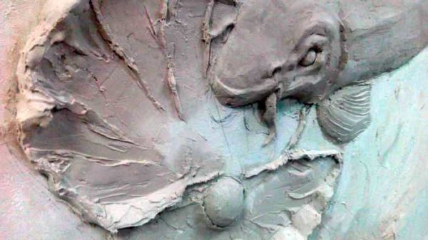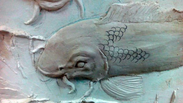 В местах, где рельеф предполагается глубокий, можно накладывать раствор не за один раз, а в несколько слоев. При этом совсем необязательно слои сглаживать. Чем более неровной получится поверхность, тем проще будет наложить следующий слой. Когда на определенном участке достигнут нужный объем (например, голова рыбы), начинаем работу над мелкими деталями — глазами, усами, жабрами и т.д.