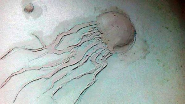 Для начала проще начать с неглубокого рельефа. При формировании мелких деталей берем небольшое количество раствора на кельму, наносим на нужное место, стараясь хорошо размазать, чтобы сцепление раствора со стеной было хорошим. Если стена покрыта грунтовкой, улучшающей сцепление (поверхность чуть шершавая и липковатая на ощупь), проблем не будет. Если детали очень мелкие — типа щупалец медузы — удобнее раствор класть мастихином.