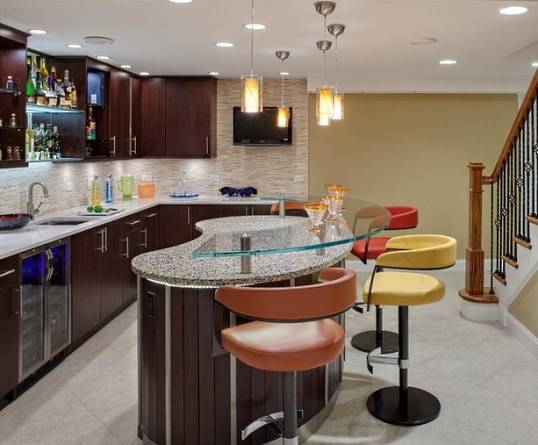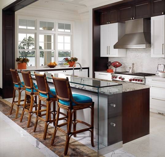 Обратите внимание, как красиво смотрится стеклянная барная стойка, продолжающаяся стеклянной панелью в пол.