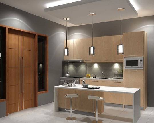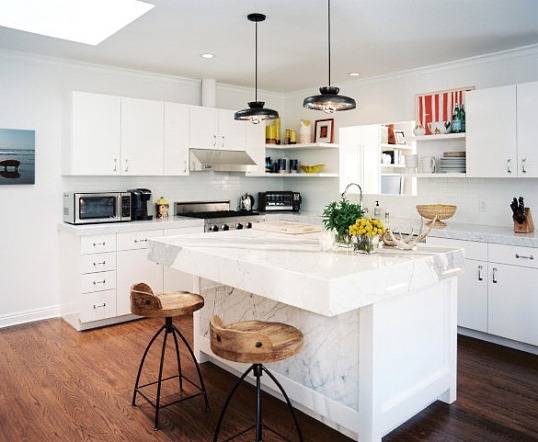 Какой цвет самый яркий и ослепительный? Конечно же белый, а потому именно с него и начнем. На рисунке ниже представлен замечательный дизайн кухни с барной стойкой, который был выполнен преимущественно в белом цвете, благодаря чему и выглядит таким богатым и свежим. Деревянные барные стулья и промышленные подвесные светильники дополняют вид и подчеркивают современный стиль интерьера.