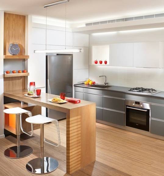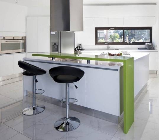 Белый цвет кухонной мебели также является самым лучшим способом подчеркнуть красочное выполнение вашей барной стойки. Согласитесь: на белом фоне любой оттенок выглядит насыщеннее и роскошнее. Для разнообразия и подчеркивания современного стиля в таких случаях используются элементы черного или серого цветов, а также оттенки из монохромной палитры.