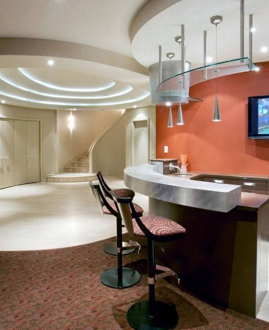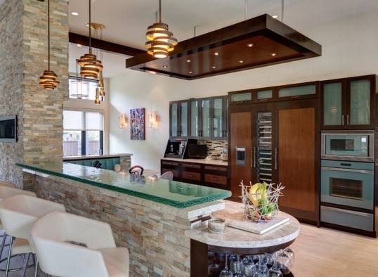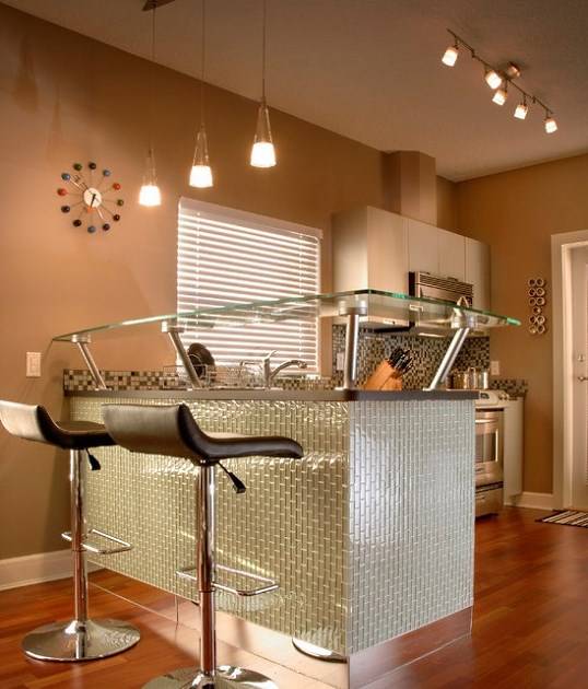И еще один момент, который вы можете отметить себе. Если пространство между барной стойкой и потолком свободно, вы можете красиво выделить эту область с помощью подвесных светильников на длинном шнуре. Это могут быть как простые светильники в количестве по одному на каждый барный стул, так и красивая спот-система, объединяющая в себе несколько ламп. Встраиваемые точечные светильники прекрасно подходят для подсветки барной стойки, если над ней имеется панель, вроде той, что на рисунке выше, или если вы располагаете маленьким помещением и не желаете визуально утяжелять потолок.