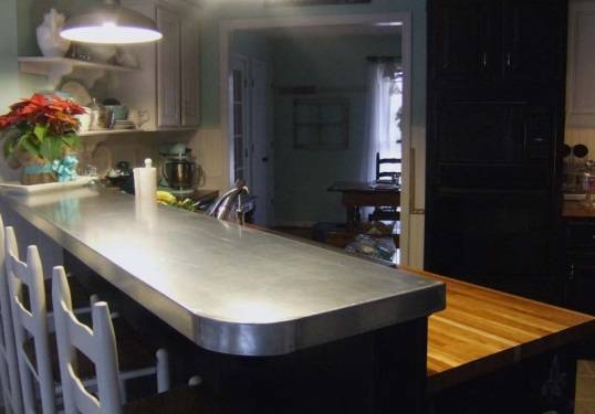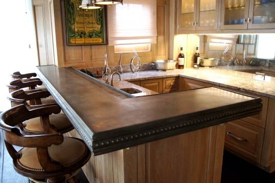 Может ли барная стойка быть частью интерьера классической кухни? Конечно! Но в таком случае мы рекомендуем вам избегать четкой геометрической формы и блеска полированной поверхности металла. Красивая отделка по периметру и искусственно состаренная поверхность — вот лучший вариант металлической барной стойки для классической кухни.