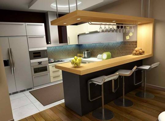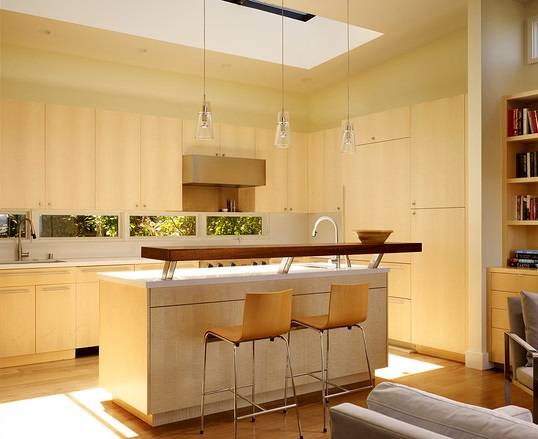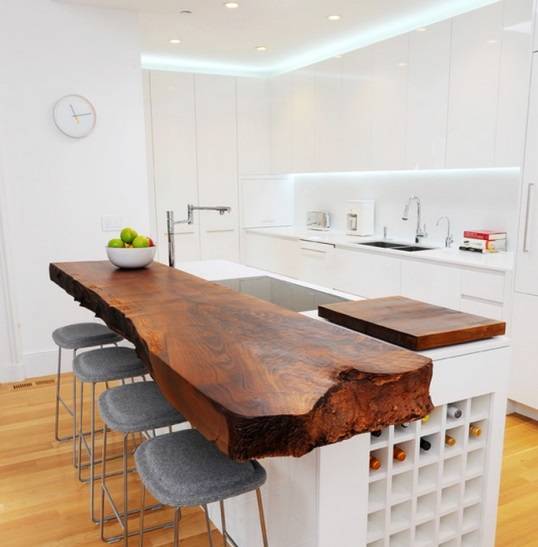 Главным трендом среди деревянных барных стоек является простая, обтекаемая на вид поверхность прямоугольной формы. Примечательной является лишь её толщина — будь она хоть немного меньше, барная стойка могла бы казаться слишком обычной, незамысловатой и даже лишенной всяческого изыска. Однако толстый кусок дерева способен придать кухне роскошь и элегантность, особенно в сочетании с белыми сидениями и металлическими ножками барных стульев.
