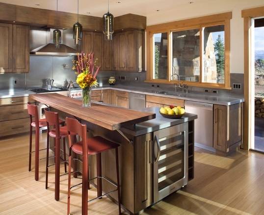 Прежде чем перейти к металлическим барным стойкам, хотелось бы продемонстрировать насколько роскошным в кухне может быть сочетание деревянных и металлических поверхностей. Деревянная барная стойка в сочетании металлическими столешницами, либо наоборот, металл на фоне дерева — контраст этот всегда создает захватывающий эффект.