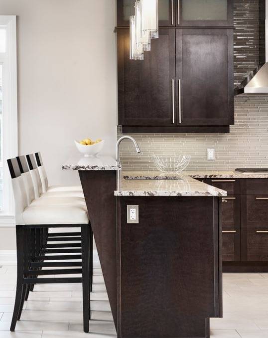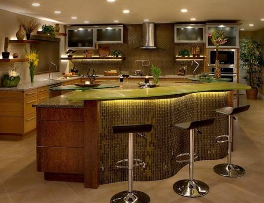 Возьмите себе на заметку, что контраст между цветом барной стойки и общей цветовой гаммой может стать основной фишкой вашей кухни. Так, если ваша кухня выполнена в темных тонах, дерево светлого цвета выделит барную стойку самым выгодным образом (доказательство представлено на рисунке выше). И, наоборот, в светлой кухне будет роскошно смотреться темный цвет столешниц.
