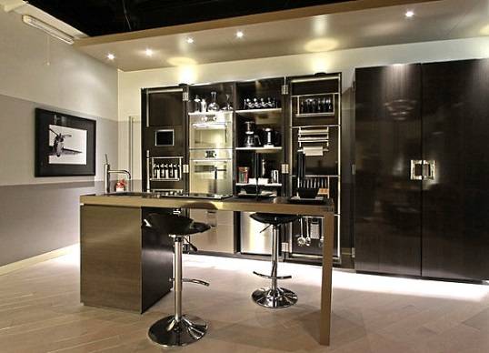 Металл является гладким и блестящим, что в полной мере соответствует современной моде. Скажем даже больше — как и дерево, металл находится вне времени: его всегда применяли, применяют и будут применять в дизайне интерьеров. Как вам нравится металлическая барная стойка на рисунке ниже? При абсолютной простоте своего дизайна она является центральным элементом интерьера этой кухни, подчеркивая её ультрасовременный стиль и образуя «остров» с блоком раковины. Стулья с черными сидениями и хромированной основой завершают вид и визуально объединяют барную стойку с остальной частью кухни.
