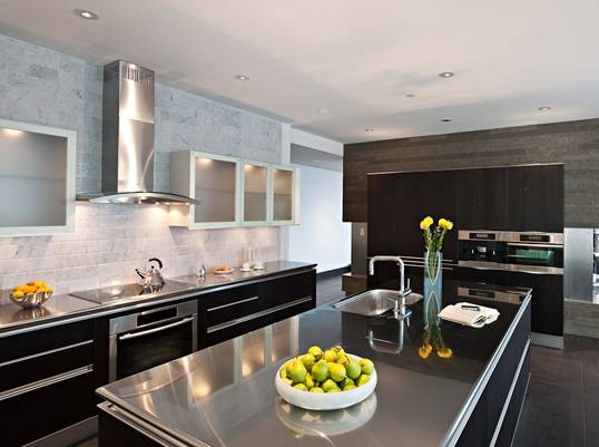 Предлагаем вашему вниманию еще один дизайн кухни, в котором металлические столешницы сочетаются с мебелью черного цвета. Здесь нет барной стойки, но мы бы хотели обратить ваше внимание на то, как были подобраны аксессуары. Возможно, вам кажется, что сочетание черного цвета с металлом и уют — понятия несовместимые. Однако на следующем фото видно, как несколько ярких элементов — ваза с цветами и блюда с фруктами, — образуют красивую композицию и добавляют помещению необходимого тепла.