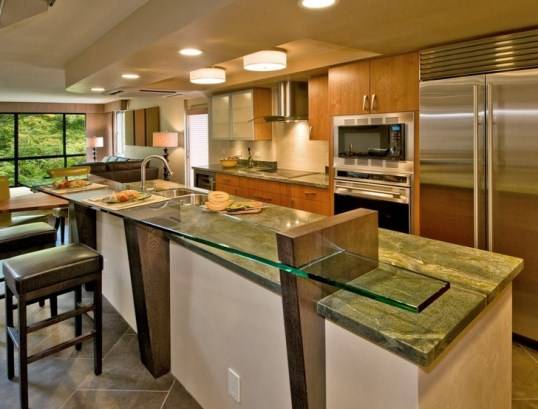 Именно из-за такой своей высоты барная стойка не может служить в качестве рабочей поверхности — она совершенно не подходит для резки и готовки. Основные преимущества барной стойки на кухне исходят как раз из того, что один человек может удобно работать, а другой — отдыхать напротив него. При этом бармен имеет удобную высоту для приготовления напитков и блюд, а вы — для того чтобы пить или есть, сидя или стоя.