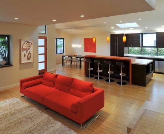 Красный цвет задает настроение в следующем интерьере. Обратите внимание, что барная стойка здесь выступает в роли центрального элемента, который объединяет обеденную зону (с её картиной, выполненной в красном цвете) с кухней и дальше — с гостиной, в которой стоит красный диван. Черные с хромированными ножками барные стулья являются идеальным дополнением, также как и огненного цвета светильники и черная мебель на кухне.