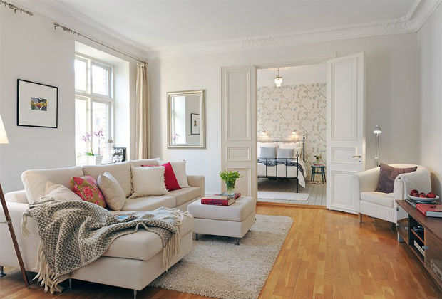 Белый фон отлично подчеркнет цветовые акценты, в роли которых традиционно выступают аксессуары, допустим зеленые диванные подушки, алые статуэтки или розовые шторы. В действительности белые обои будут прекрасно смотреться с абсолютно любой по цвету мебелью, а также разными по тону декоративными вещицами. Но все же, чтобы интерьер казался правильным и гармоничным, не стоит перегружать его массой сопутствующих тонов, два-три цвета будет достаточно!