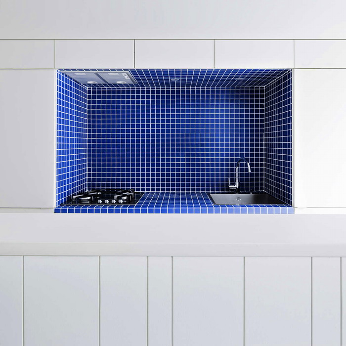 В такую же цветовую яркую нишу спрятана и рабочая часть кухонной зоны.