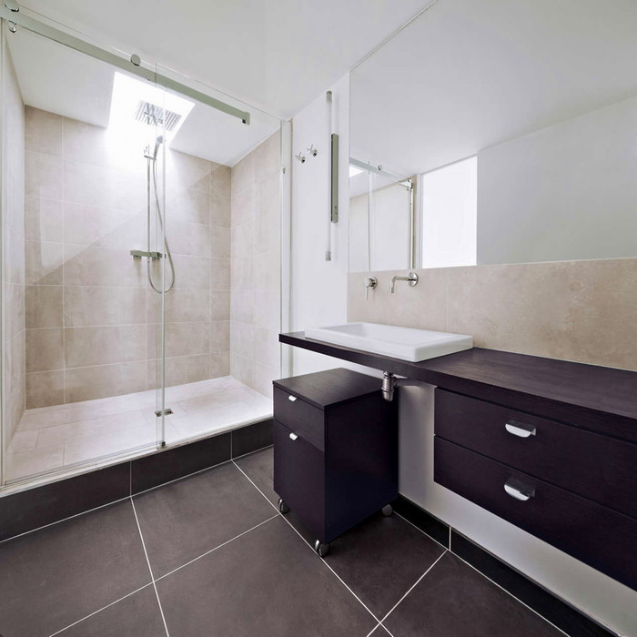 Интерьер ванной комнаты. Аскетически сдержан и функционален.