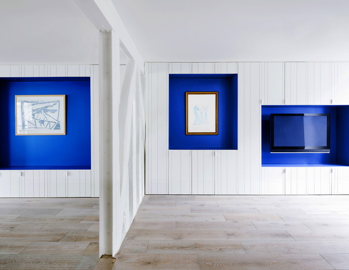 Светлая отделка и подчёркнутая яркость ниш позволила по всей длине стены спрятать, необходимые в интерьере, шкафы, места для хранения.