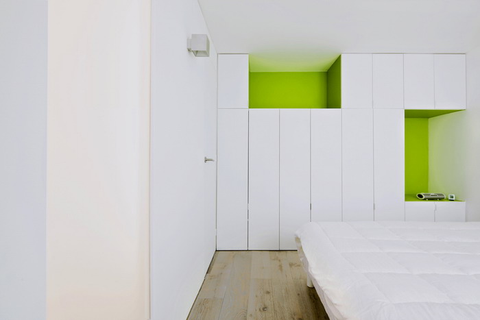 В спальне работает тот же приём: фасады мест хранения сливаются с цветом стен.