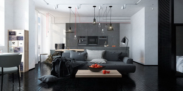 Так как общий фон пространства выполнен в серых приглушённых тонах смягчите впечатление яркими пятнами: необычной формой и цветом мебели, например.