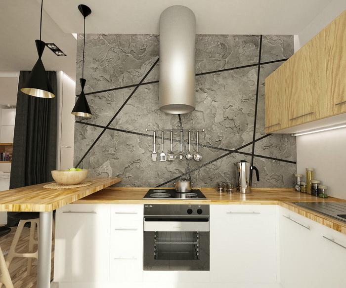 На кухне бетонной может быть стена в зоне приготовления пищи. Белые стены, кирпичная кладка, дерево дополнят интерьер, а хрустальные люстры и мягкие ковры сделают его более мягким и интересным.