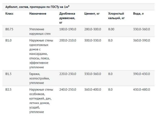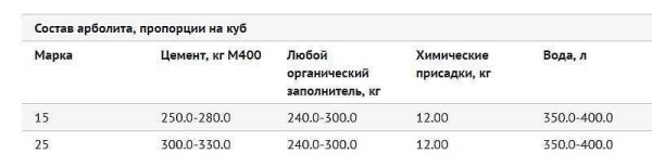 Количество необходимых материалов на один кубометр арболитового раствора есть в таблице (фото выше).