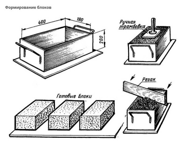 Раствор выкладывают в формы. Чаще всего они сделаны из металла, представляют собой ящик с ручками без дна. Форму ставят на ровную поверхность (доску, например). При ручной трамбовке формы заполняют арболитовым раствором, послойно, каждый из которых прессуют металлической площадкой с ручкой. Для того чтобы воздух выходил лучше, толщу материала прокалывают несколько раз металлическим стержнем, после чего снова прессуют. Такая процедура может повторяться несколько раз, до тех пор, пока не достигнете желаемой плотности слоя, после чего можно засыпать следующий. Слои насыпают до верхнего края блока, после окончательной трамбовки верхушку ровняют, срезая лишнее металлической планкой.