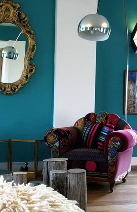 Богемный стиль не боится никаких цветовых сочетаний, ведь главным предназначением интерьера — является обратить на себя внимание, придать ему торжественности и пышности.