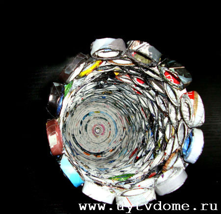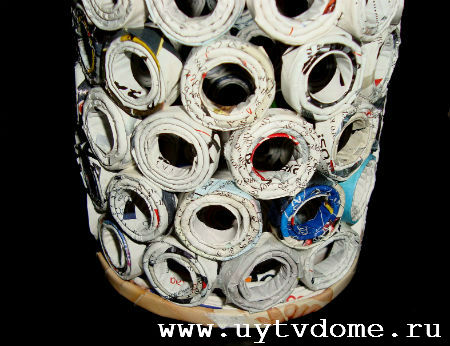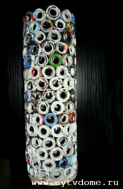 Как только невысокий цилиндр будет заполнен, вырезаем следующую полоску бумаги, опоясываем основной цилиндр, и так же как в предыдущем случае — вкладываем в него покрытые клеем скрутки. По данной схеме продолжаем приклеивать колечки дальше, до самого верха. После чего ваза из журнальных скруток должна хорошенько просохнуть, поэтому оставляем ее на просушку, примерно на 10 — 14 часов.