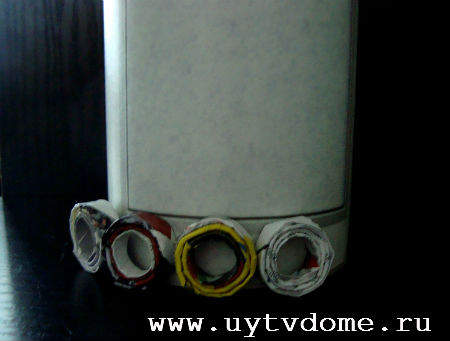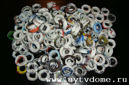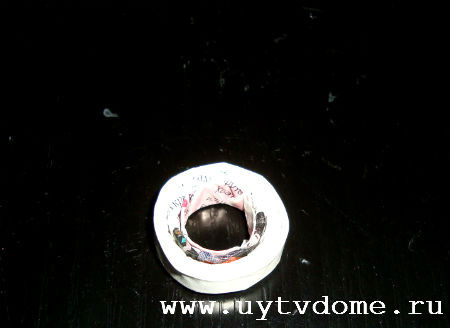 После чего промазываем клеем ПВА журнальные колечки (по одному) и вкладываем их в пространство между основным высоким цилиндром и невысоким цилиндром. Без такого опоясывающего цилиндра, колечки, к сожалению совершенно не сцепляются друг с другом, только если, приклеив колечко, долго придерживать его рукой, пока клей не просохнет (но это очень долго, поэтому поступаем описанным выше образом).