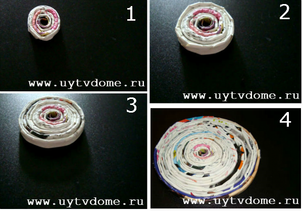 В то время пока ваза из скрученных журнальных колечек — сушится, мы начинаем изготавливать донышко будущей вазочки. Для этого накручиваем на шпажку (не на батарейку) плоские журнальные трубочки, на дно данной вазочки ушло 6 полосок, каждую полоску хорошенько проклеиваем клеем ПВА, причем не только на кончиках, но и между слоями.