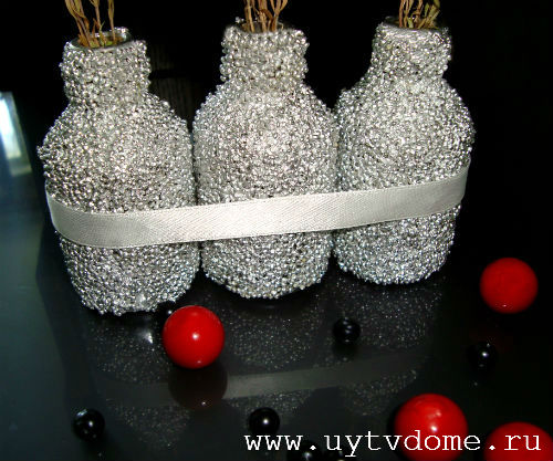 На завершающей стадии, по желанию — приклеиваем бантики, повязываем ленточку, веревку или шерстяную нить. Изделия из веревок можно посмотреть здесь, а варианты применения стеклянных бутылок изучить здесь.