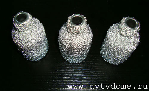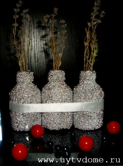 По вышеописанной схеме, изготавливаем оставшиеся вазы из стеклянных бутылок. Оставляем их сушиться примерно на 6 часов.