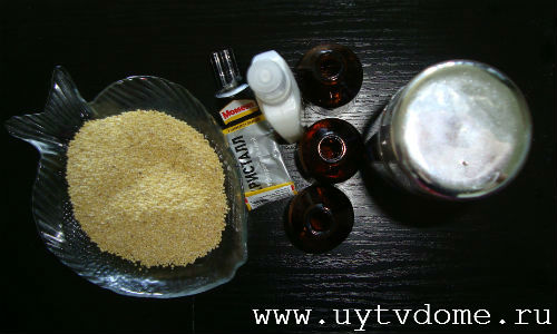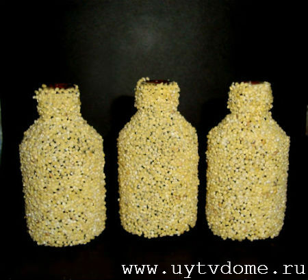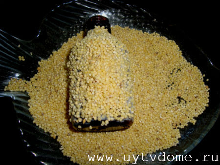 После чего посыпаем бутылочку пшенной крупой. Лишнее пшено просто стряхиваем, а пробелы — заполняем крупой.