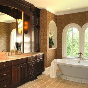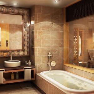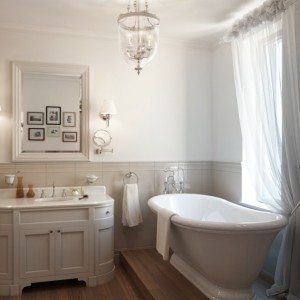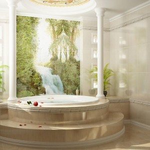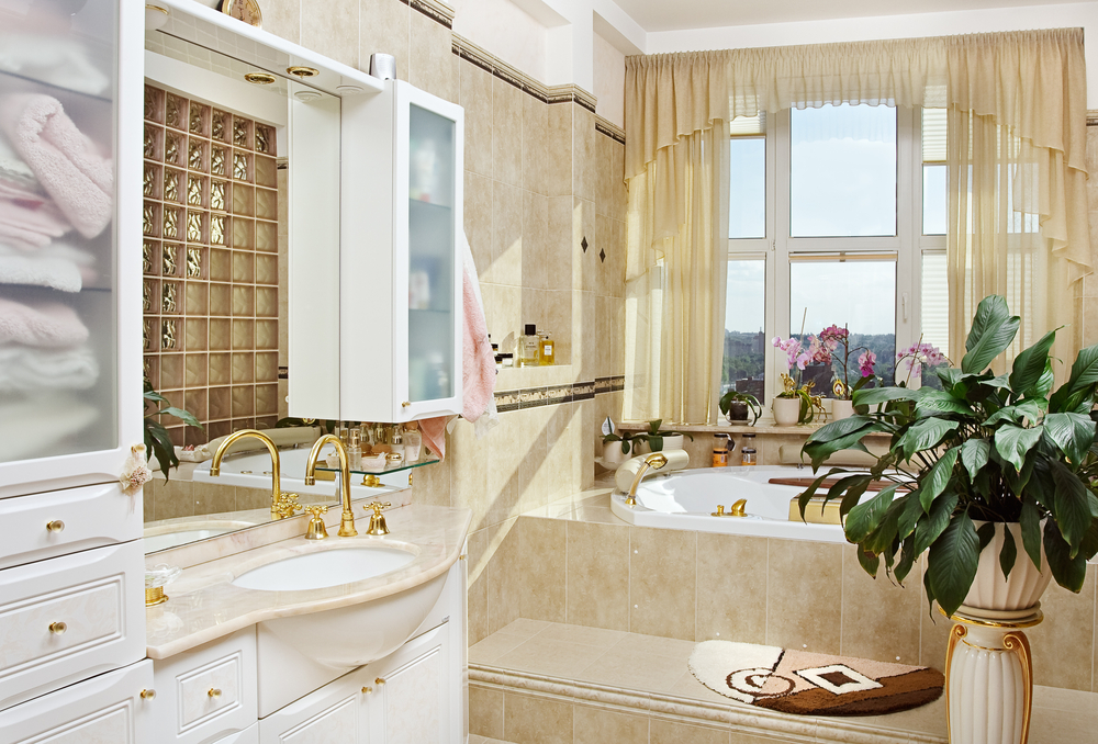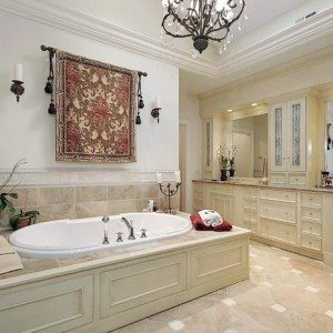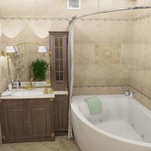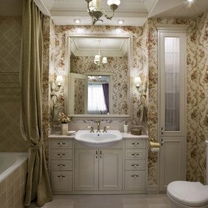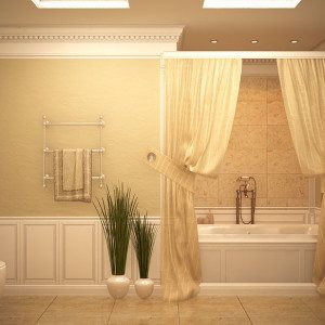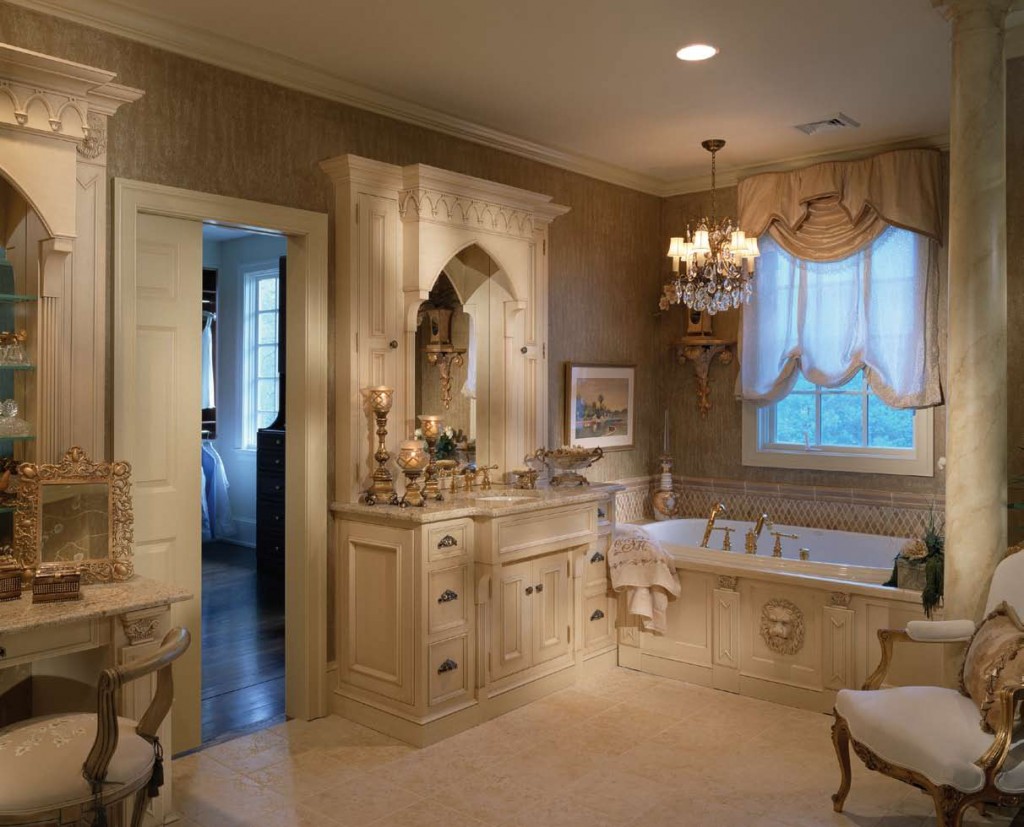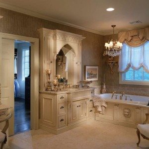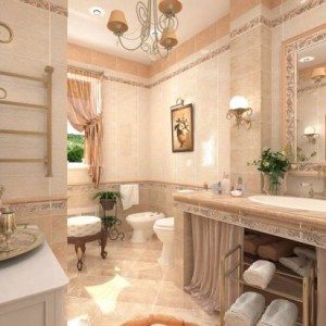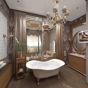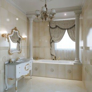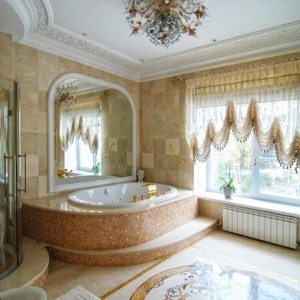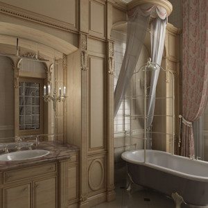В интерьере допускается использование камня, деревянных шпалер, тяжелых портьер. Наличие драпировок на окнах и балдахина над ванной создают особую атмосферу мягкости и интима.