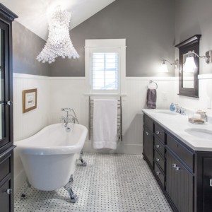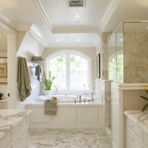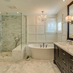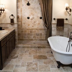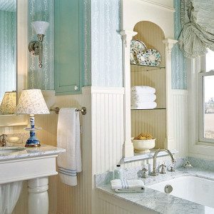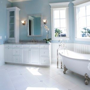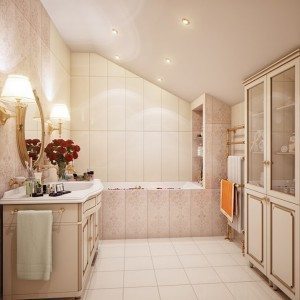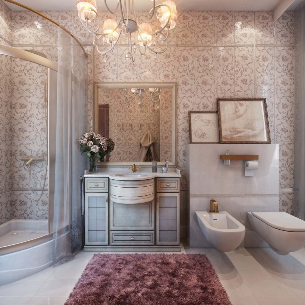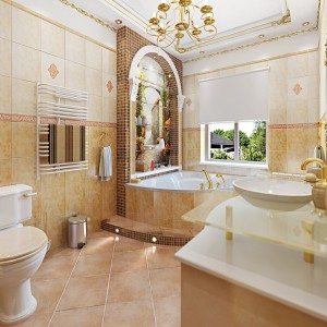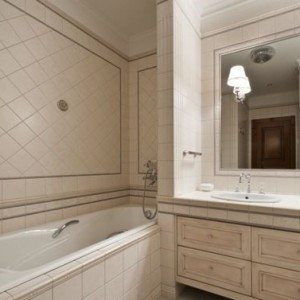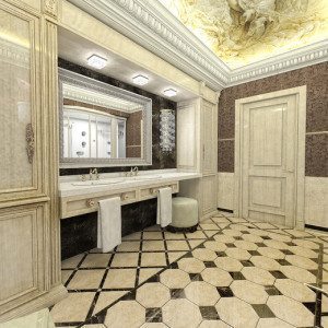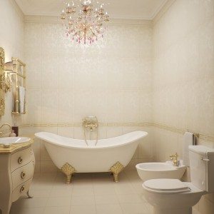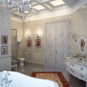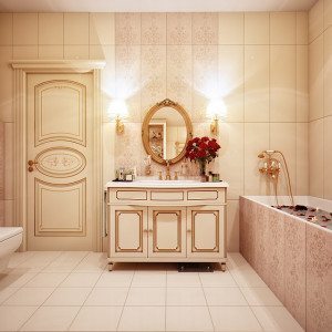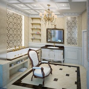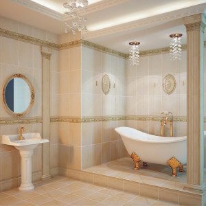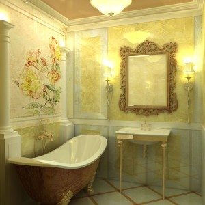 Создавая интерьер ванной комнаты классического стиля, используют особую отделку стен, потолка и пола.