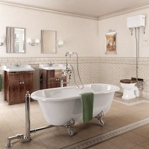 Центральное место в помещении занимает, конечно же, ванна в классическом стиле. Чаще всего такие ванны изготавливаются из латуни либо чугуна — материалов, имеющих низкую теплопроводность.