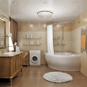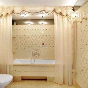 • драпировка потолка тканью в тон общего колера помещения, для придания дворцовой пышности ванной.