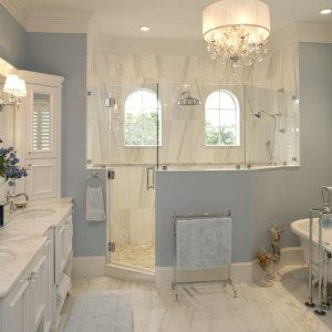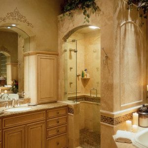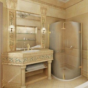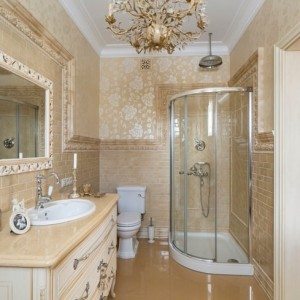 Многие полагают, что Драпировка стен в ванной исключает применение душевых кабин. Однако это не так. К примеру, итальянскими производителями, предлагаются решения стеклянных ограждений для душевых кабин с использованием витражей и геометрических рисунков классического стиля, которые не нарушат целостность интерьера ванной комнаты. Можно также запланировать строительство отдельного модуля для зоны душевой.